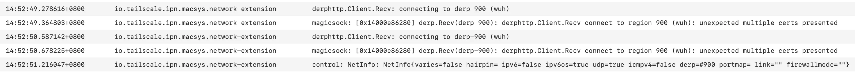 magicsock: [0x14000116000] derp.Recv(derp-900): derphttp.Client.Recv connect to region 900 (wuh): unexpected multiple certs presented